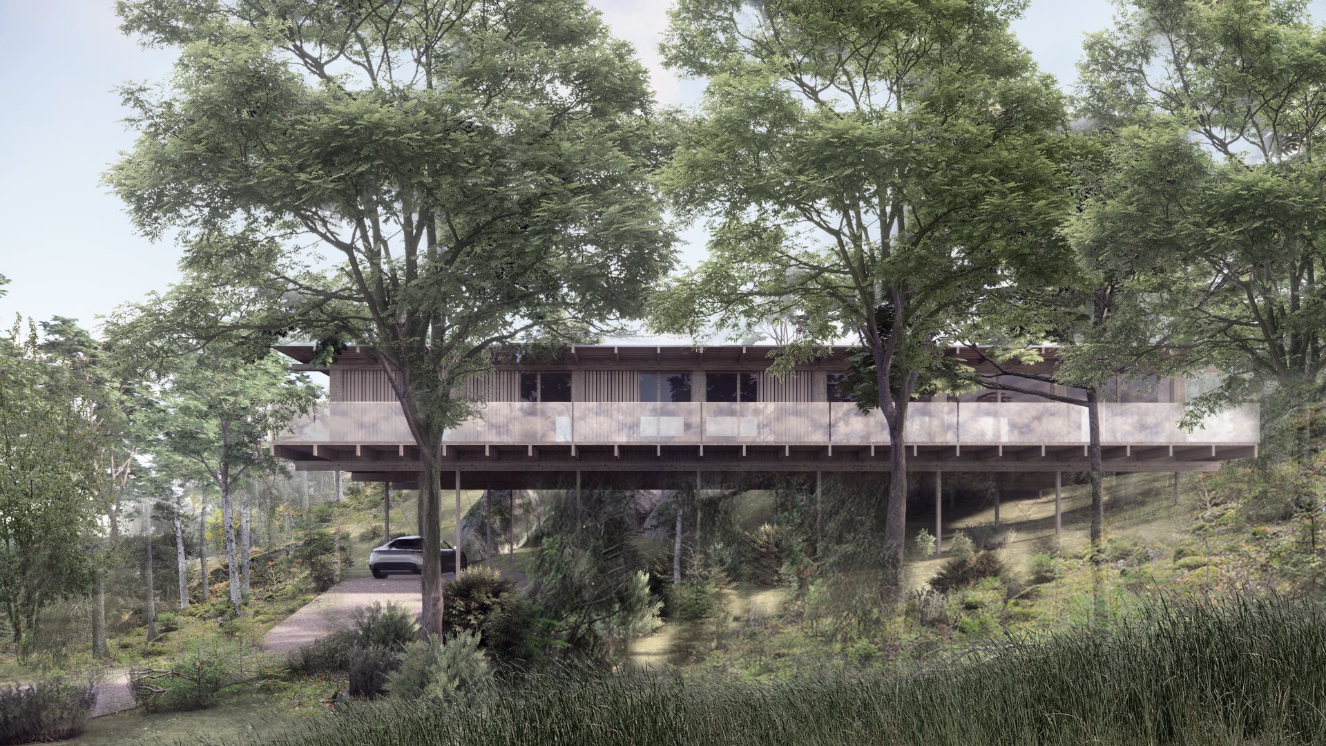 Huset annonserar sig från gatan som en upphöjd horisontell träkonstruktion bland de vertikala tallstammarna. Entrén nås genom att först röra sig under huset och sedan upp via en trappa mellan klippväggen och det ”svävande” huset. Terrassen figursågas efter klipporna och agerar länk mellan den sociala zonen och naturen. Den privata delen ligger i andra änden av huset där, avståndet till marken är som störst. En dröm om att bo uppe bland trädtopparna."