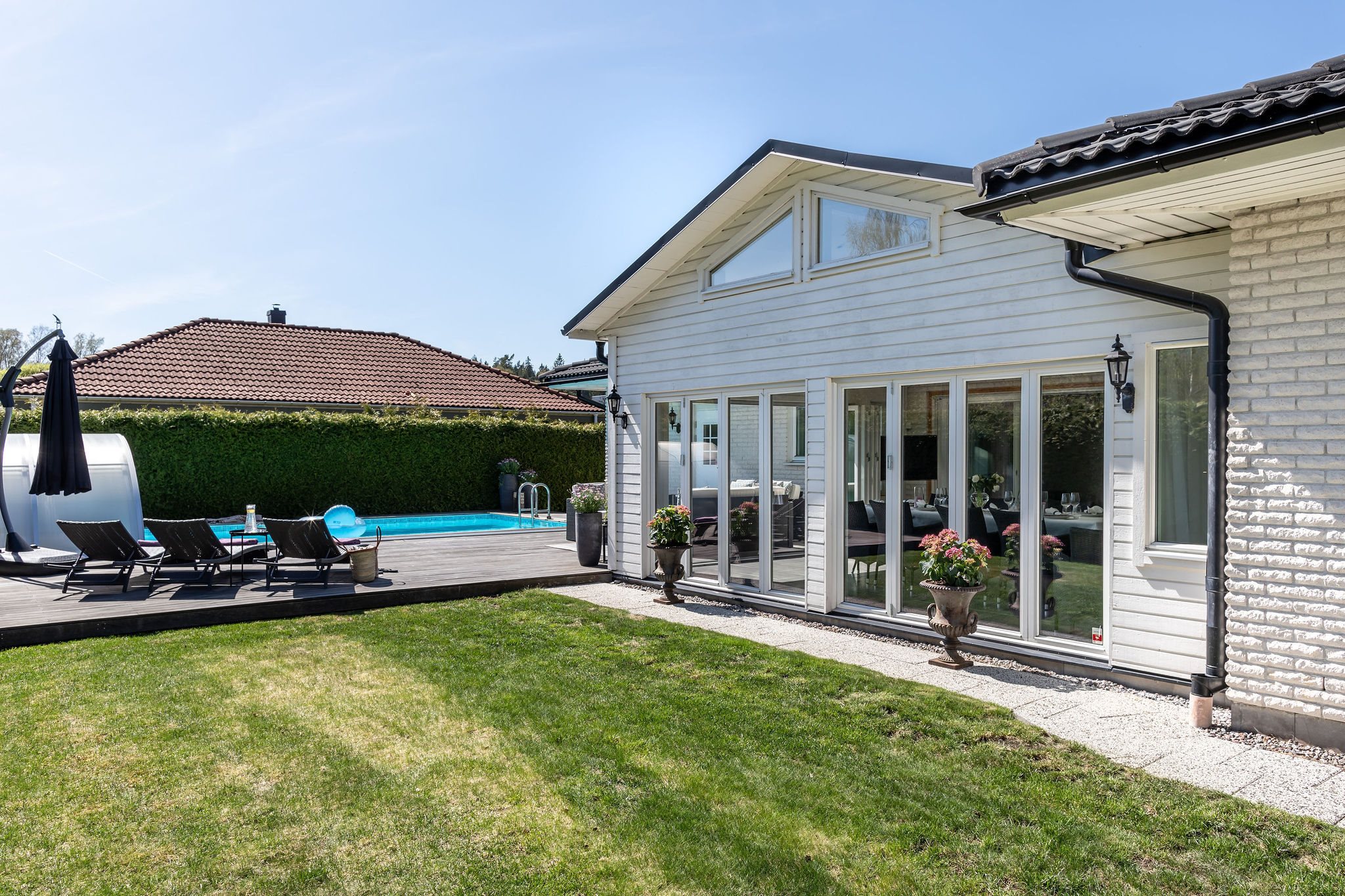 Bl a finns här en utomhuspool i ett soldränkt läge, helt insynsskyddat tack vare de höga tujahäckarna som ramar in bostaden, ett uterum med vattenburen golvvärme och kamin (skönt vintertid!) som byggdes till bostaden 2009, fem sovrum, generösa sällskapsutrymmen, tre toaletter, bastu, bubbelbadkar, ett stort kök med massiva ekluckor/lådfronter och granitbänk, garage med ingång till bostaden mm. Listan kan göras längre - och kommer göras längre när bostaden kommer läggas ut till försäljning.