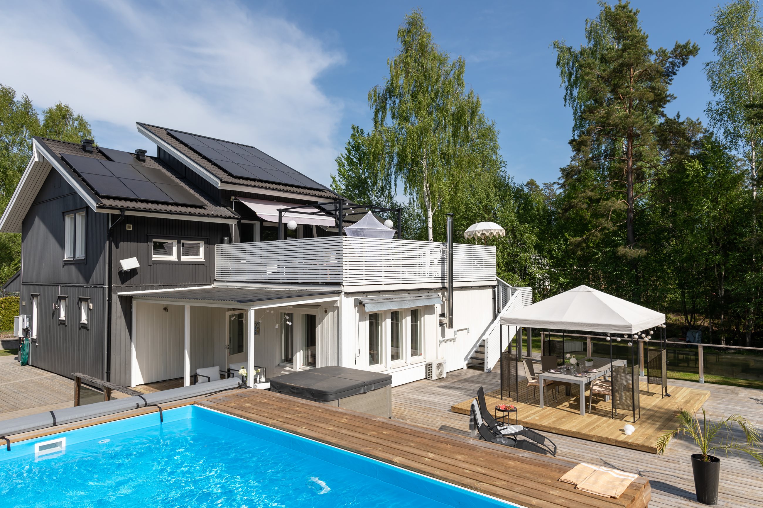 Här bor du med ett ogenerat läge och har skogen som granne på en tomt som fullkomligen badar i sol. Trafiken utanför huset är minimal och i området finns barn i alla åldrar. Pool, gym, vinrum, hiss, solcellstak och ett fristående dubbelgarage, är bara några av attributen här på på Bodils Väg 13.
