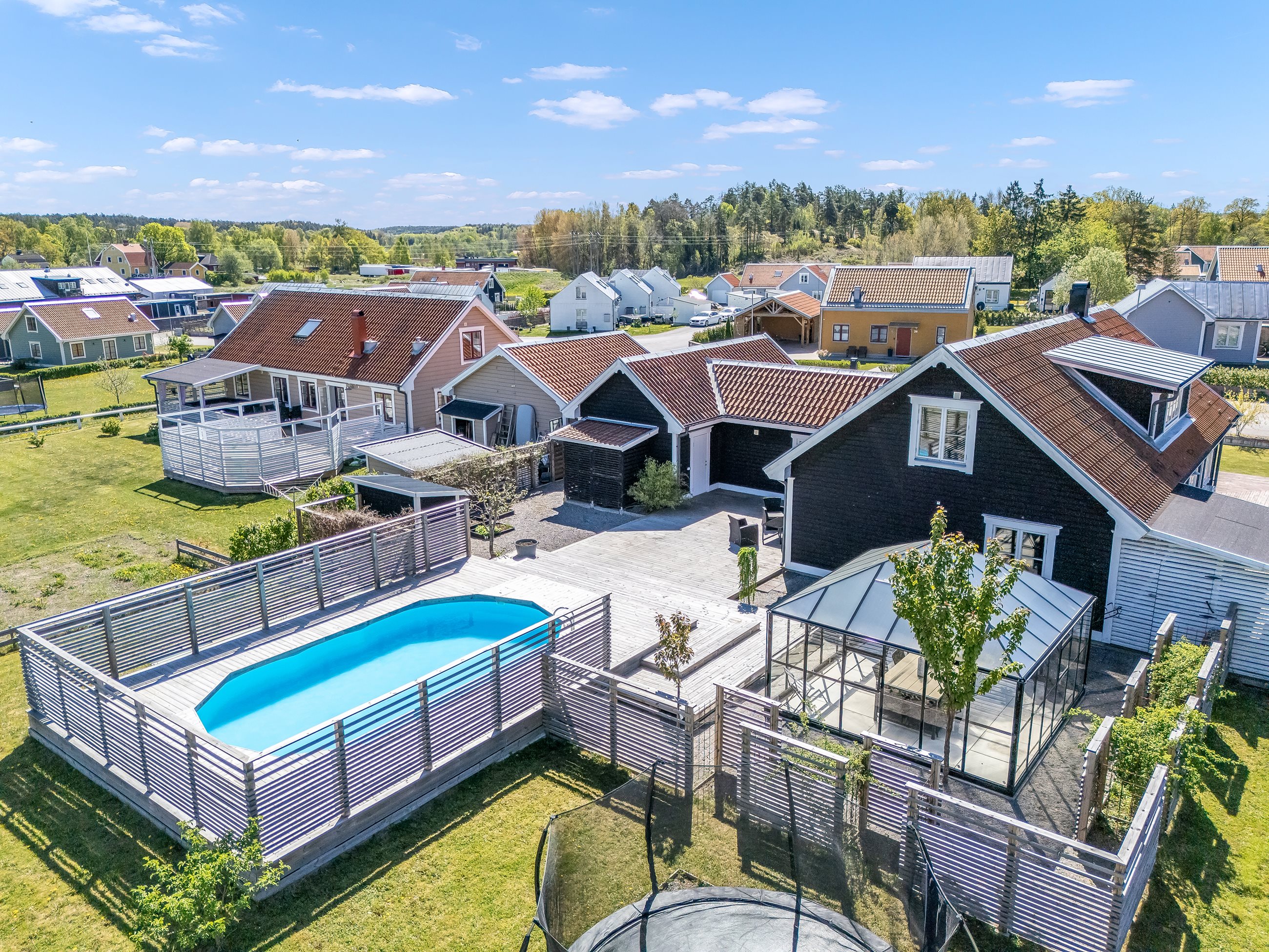 Från både kök och vardagsrum kliver du ut på den solvarma altanen – en naturlig förlängning av hemmet under årets ljusare månader. Här möts poolens svalka, orangeriets magiska middagar under ljuslyktor och doften av tomatplantor och den stora gräsmattans rofyllda ytor - där både lek och vila får sin plats.