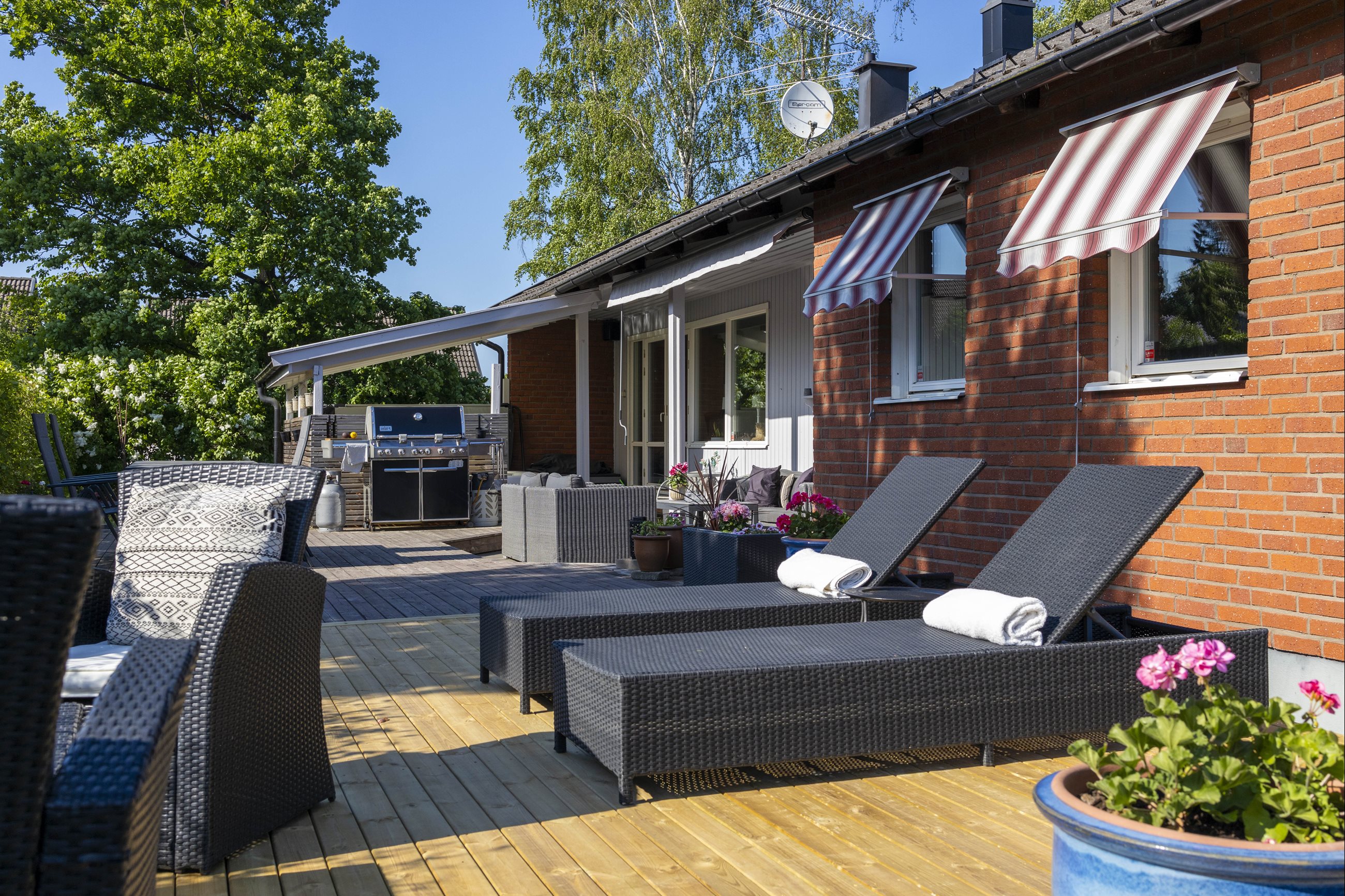 De monterade högtalarna på altanen och den tillhörande förstärkaren av märket Sonos lämnas kvar/ingår i köpet.