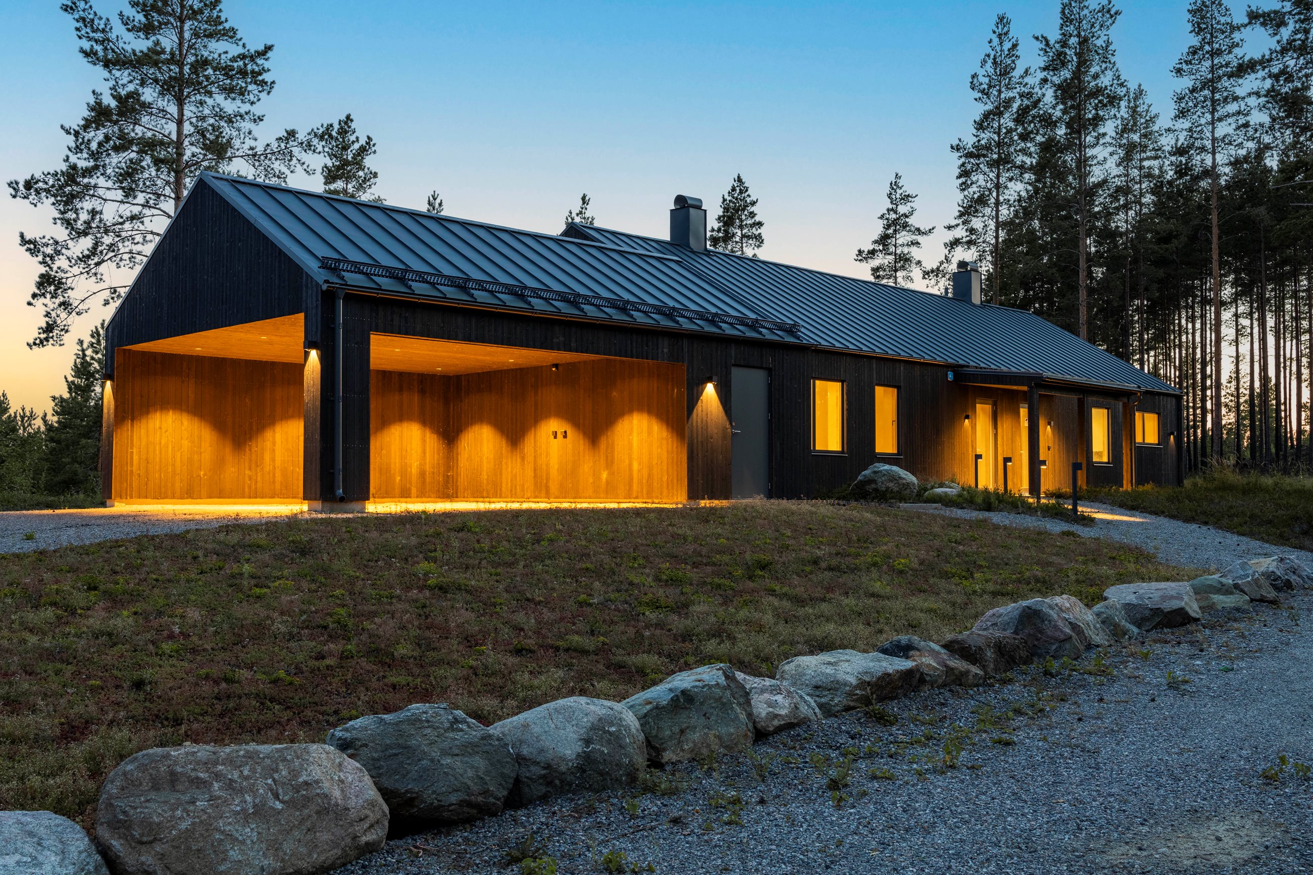 "Planlösningen är en variant av det mest uppskattade enplanshuset som togs fram av byggfirman Sjöberg & Thermé, där min yrkesbana gick från snickare till in-house arkitekt. Genom Carporten och huvudbyggnadens norra fasad skär en centrumlinje. En relation sinsemellan som skapar både ett publikt rum på entrésidan, samtidigt som passagen mellan byggnaderna leder in till den privata trädgården och uteplatsen på husets södra sida. En rymlig öppen planlösning med siktlinjer i alla väderstreck kombinerat med mjuka övergångar till de privata delarna, skapar utrymmen att både umgås och dra sig tillbaka i. Det stora fönsterpartiet i kök/vardagsrum kommer verkligen till sin rätt på den insynsskyddade tomten. En platsgjuten uteplats i betong med en pergola skapar ytterligare ett rum innan tomten sluttar brant och utsikten tar över", skriver Jorian Egge.