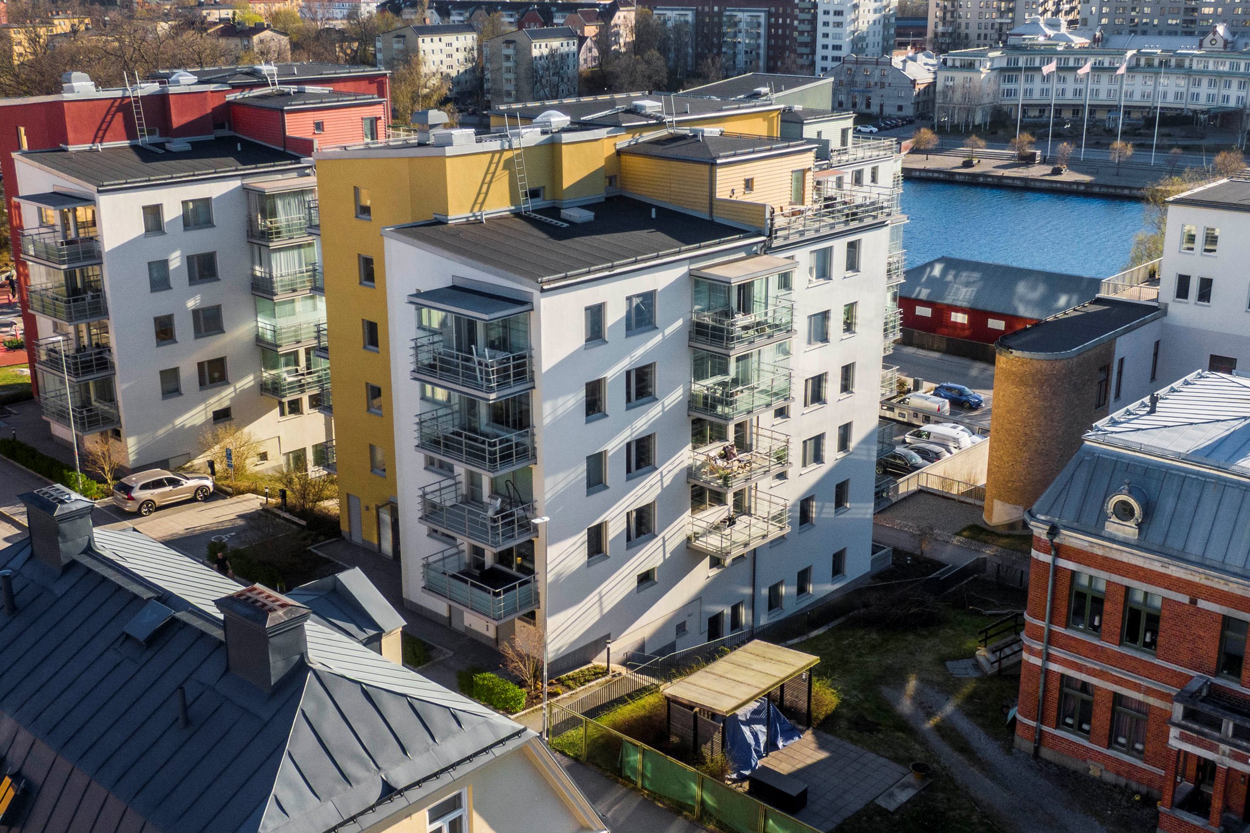 Promenadstråk slingrar sig längs vattnet och i kvarteret finns parker, små grönytor och stillsamma sittplatser för dig som vill ta en paus. Närheten till centrum gör att du har restauranger, butiker, vård och service bara minuter bort – samtidigt som kvällssolen speglas i Mälaren utanför fönstret.
