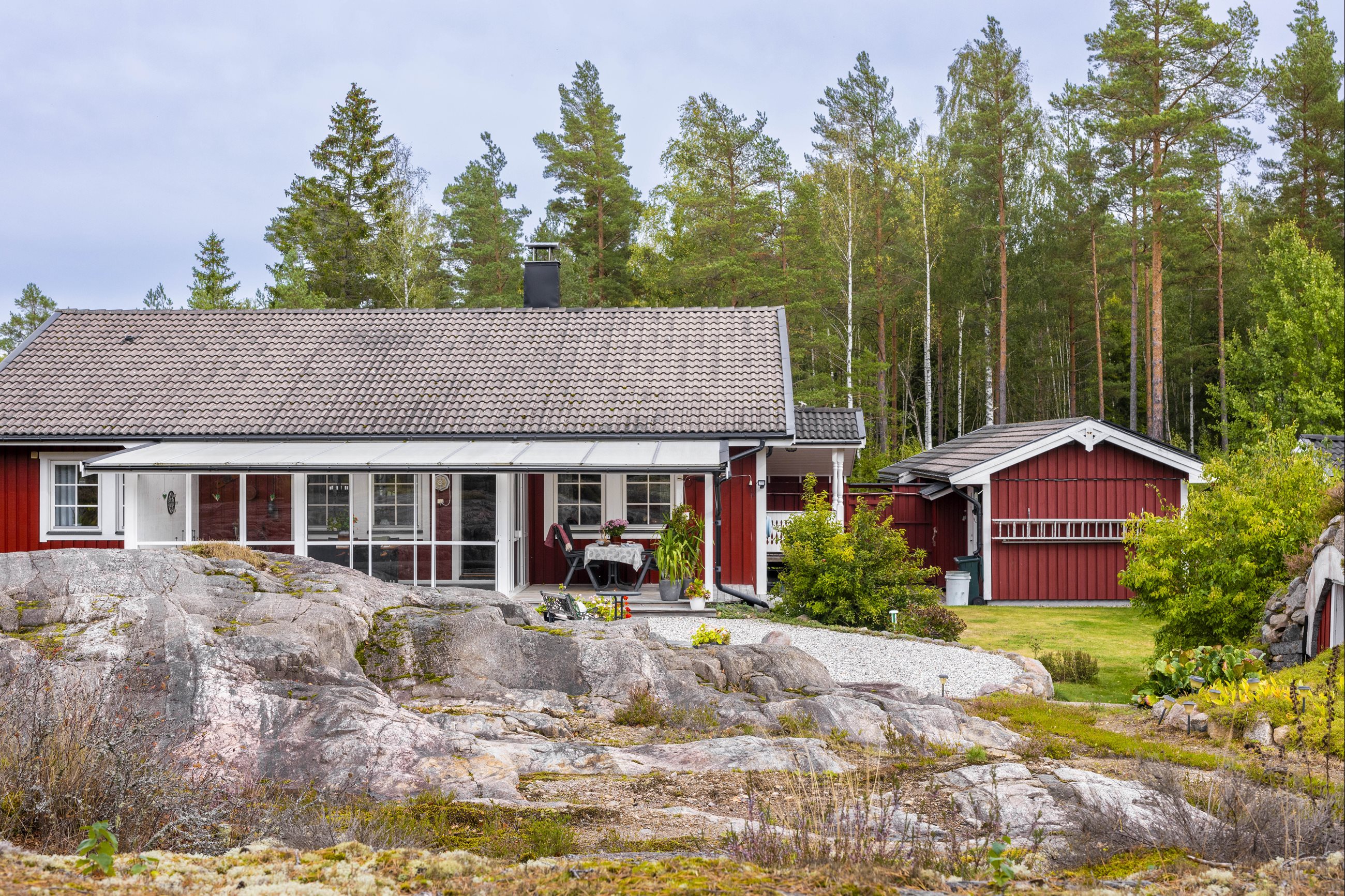 Nu kan jag äntligen meddela att det här välplanerade och välbyggda BRA-huset med allt i ett plan, bjuds ut till försäljning. Bostaden är lantligt belägen på en stor hörntomt med några få grannar på behörigt avstånd - fritt från insyn! Tomten är delvis trädgårdstomt med gräsmattor och fruktträd, delvis naturtomt med berg i dagen på baksidan av boningshuset. Där är det en nästan västkustsk känsla med karga klippor och det måste vara ett spännande landskap för barn eller barnbarn att leka på (tankar har även funnits att arrangera en pool bland stenhällarna). På den intressanta tomten finns ett vinterbonat gästhus med dusch och toalett om ca 27 kvm, med möjlighet att anordna ett pentry (om bostaden ska fungera som ett generationsboende eller för uthyrning). Gästhuset ligger i direkt anslutning till groventrén och tvättstuga (där även dusch och en vedeldadbastu finns för övrigt), vilket gör det praktiskt ur ett annat hänseende också. Vidare finns det en vedspis i köket och en kamininsats i öppna spisen i vardagsrummet. Ursprungligen fanns det tre sovrum i huset. Då nuvarande ägare, tillika de som lät bygga bostaden, inte har haft behov av så många sovrum, lät de öppna upp mellan de båda sovrummen som låg direkt till höger från entréhallen. Det är numera ett enda stort rum som idag används som kontor.