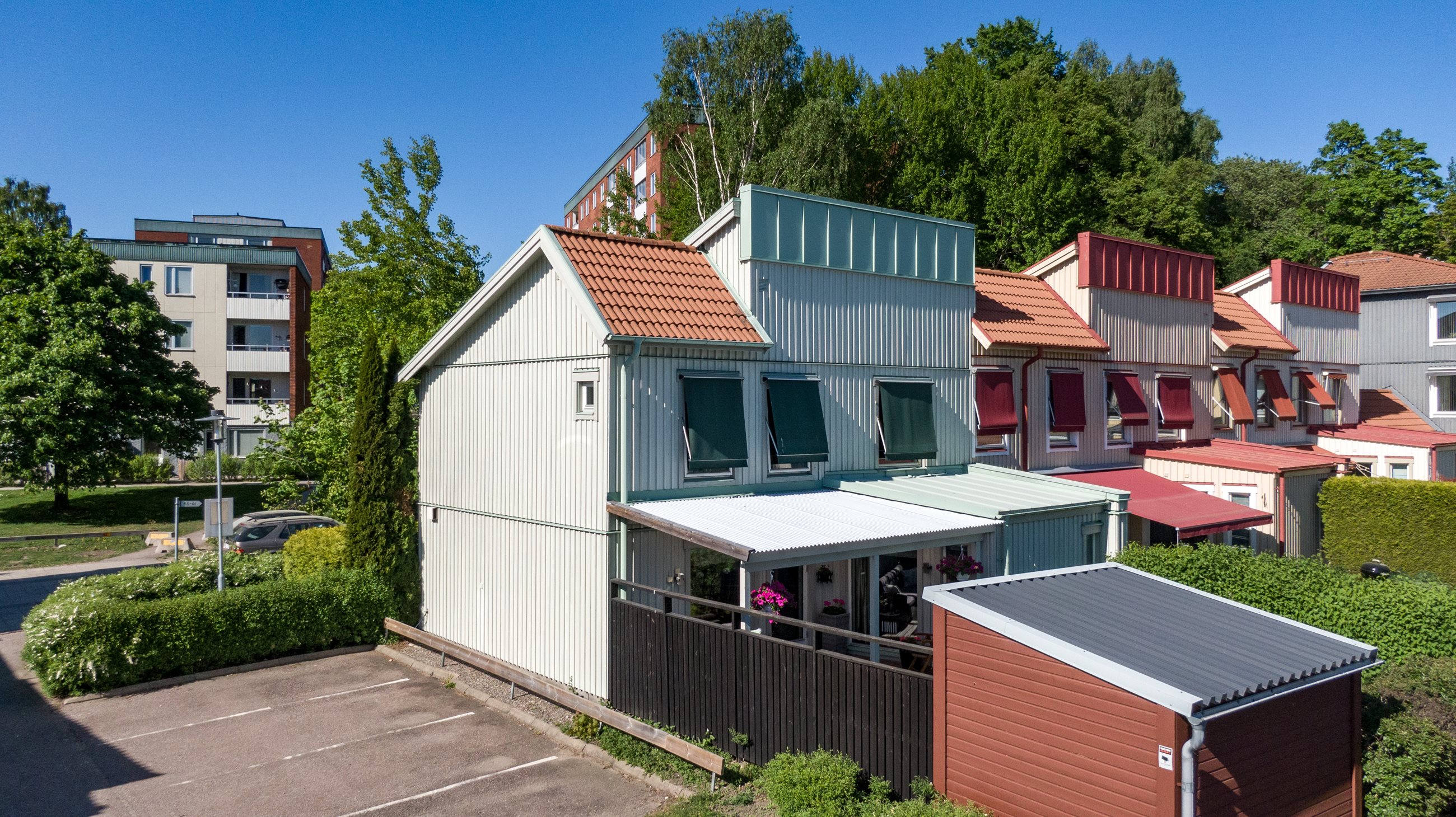 Huset är byggt på ett sätt som gör att takhöjden varierar på övre plan. Byggnadens form undviker raka vinklar, man kan nästan se lite antroposofiska och engelska influenser. Mycket ljus kommer in då alla större fönster är i söderläge, och att de har markiser. För att vara radhus är det väldigt lite påverkan från grannar då inga väggar ligger direkt ann mot grannen (det är ett cykelförråd emellan). Uteförrådsbyggnaden, staketet och häckarna ger uteplatsen en mysig framtoning då det är en hörntomt.