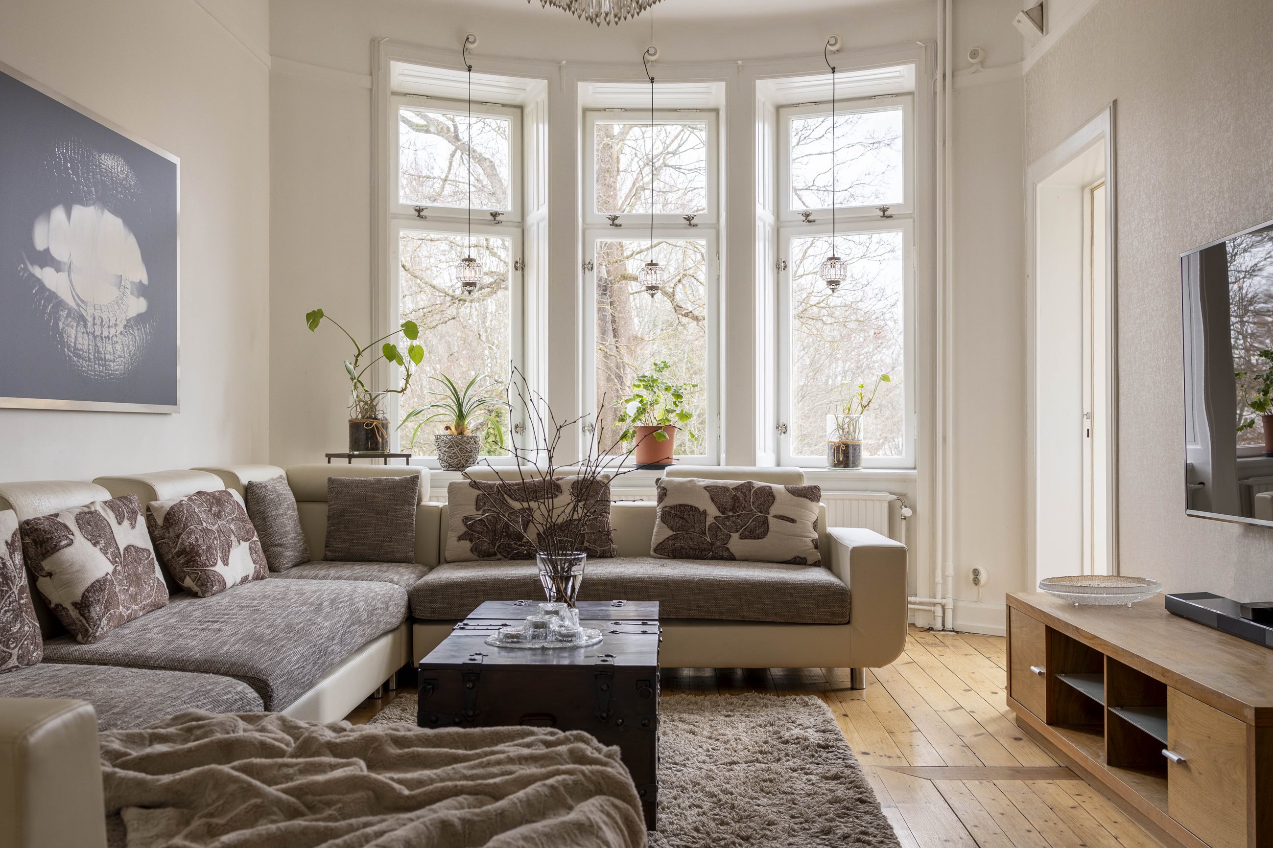 Den rymliga våningen disponerar ca 176 kvadratmeter som är fördelade på fem rum och kök. Våningen har under det senaste decenniet genomgått omfattande renoveringsarbeten där såväl kök och badrum har moderniserats samtidigt som originaldetaljer har underhållits.