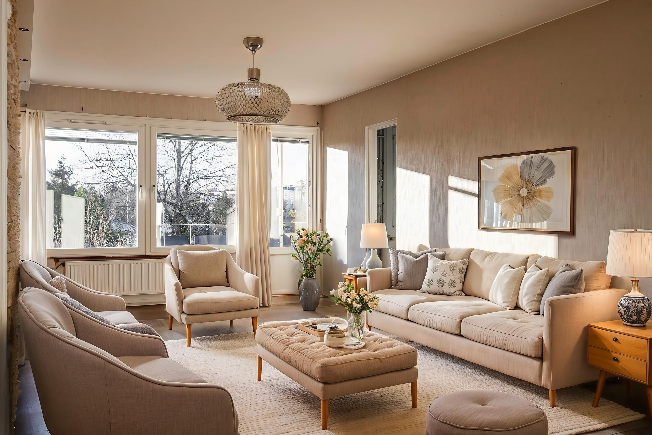 Det här är ett hem där ytorna öppnar sig i takt med att man rör sig genom bostaden. Ljuset faller mjukt in från flera håll och binder samman de sociala delarna med de mer privata. Här finns en stillhet som märks redan vid första steget in. En känsla av att huset byggdes för att rymma liv över tid, med rum som tillåter både rörelse och ro.