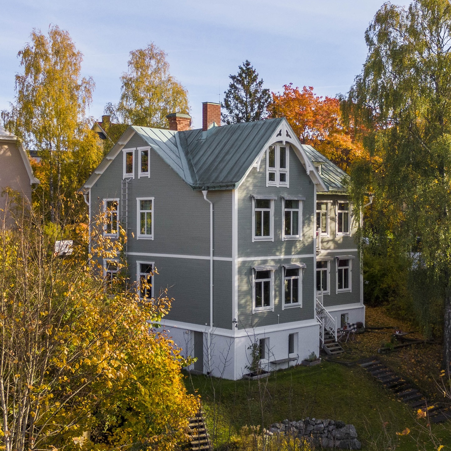 Jag kan bokstavligen känna historiens vingslag när jag besöker bostaden sommaren 2022. Även om byggnaden har renoverats med varsam hand under åren, finns många tidstypiska detaljer kvar. ”Känslan av att bo i en herrgårdsmiljö är ständigt närvarande”, berättar Hanna och Johan som bor här nu. Här finns bl a fyra kakelugnar (ej i bruk), djupa fönsternischer med massiva bänkar i natursten och takplafonder mm. Under de senaste fem åren har t e x kök och badrum (på entréplan) byggts om, elen i huset bytts ut, golv slipats, fasaden renoverats och i princip alla ytskikt (bortsett från badrummet på övre plan som renoverades 2005) genomgått en ansiktslyftning.